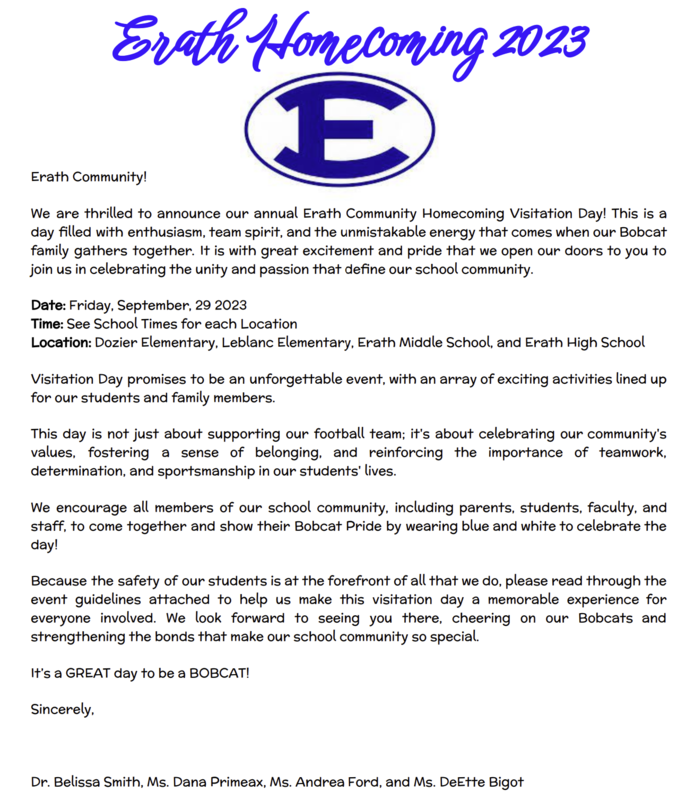 We are thrilled to announce our annual Erath Community Homecoming Visitation Day! This is a day filled with enthusiasm, team spirit, and the unmistakable energy that comes when our Bobcat family gathers together. It is with great excitement and pride that we open our doors to you to join us in celebrating the unity and passion that define our school community.