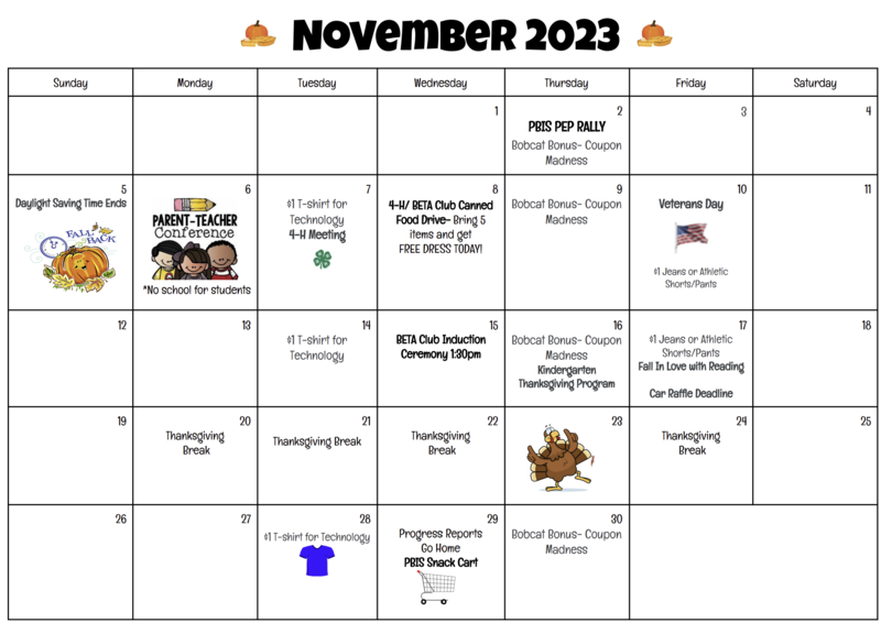 •Thursday, November 16, 2023 Kindergarten Thanksgiving Program- Our kindergarten students have prepared a wonderful program as they learned about Thanksgiving. We invite the family members of our Kindergarten students to join us for this event. Bobcat Bonus- Coupon Madness- Coupons will be decided by grade level and sent home on Wednesday before Bobcat Bonus Day.