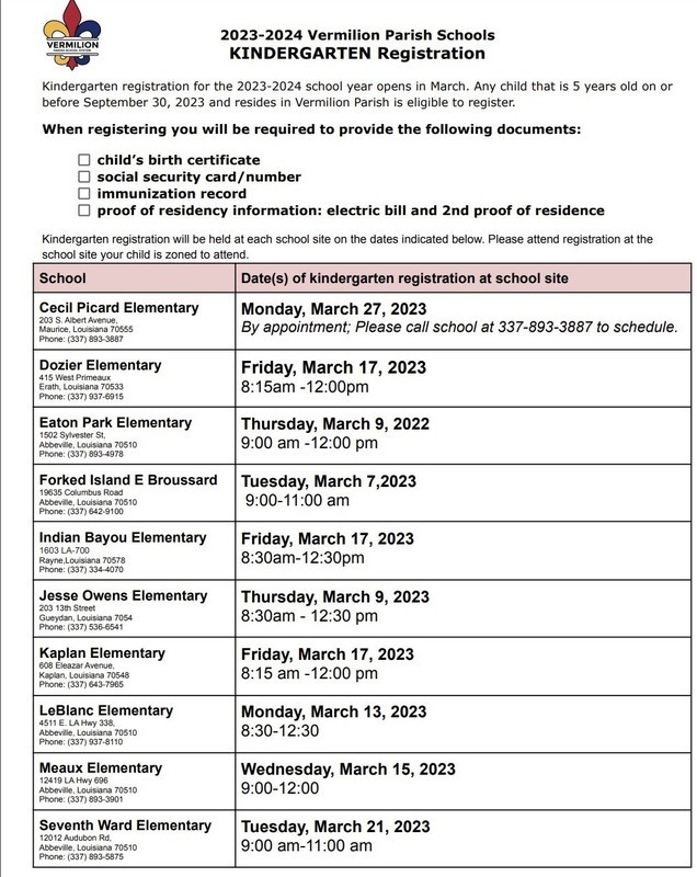 Kindergarten registration is Friday, March 17, 2023, from 8:15-Noon at Dozier Elementary. Registration will be held in the lobby of the gym.